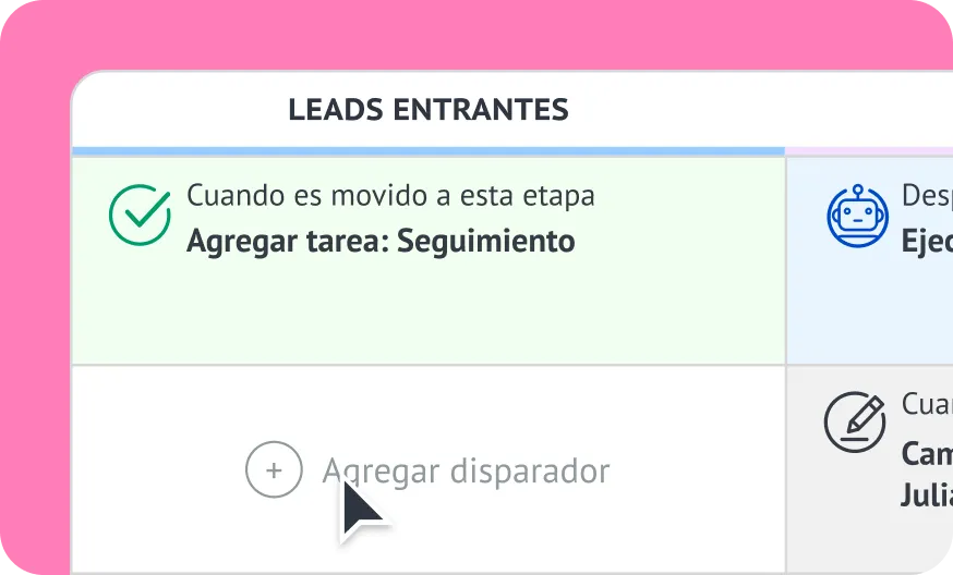 Ahorra tiempo en tareas repetitivas. Flujos de trabajo automatizados para la entrada de datos, asignación de leads y configuración de tareas se pueden configurar en tan sólo unos clics.